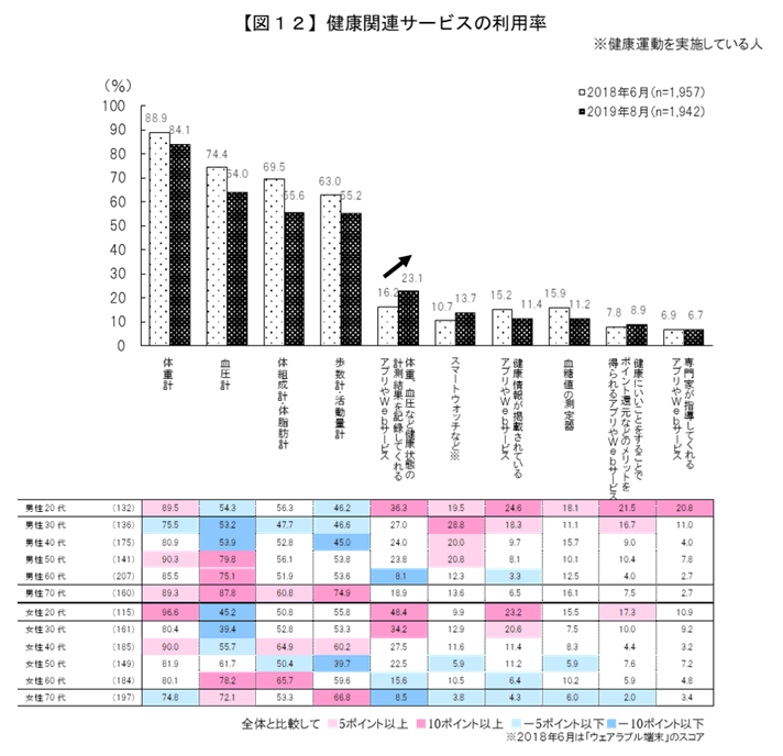 利用している健康関連サービスについて、2018年に実施した調査結果も合わせて推移を示しました(図12)。「体重、血圧など健康状態の計測結果を記録してくれるアプリやWebサービス」の伸びが顕著で、特に20代、30代の女性に受け入れられています。スマートデバイスを活用したさまざまな健康関連サービスが登場しており、手軽に健康管理ができる点で支持されていると考えられます。
