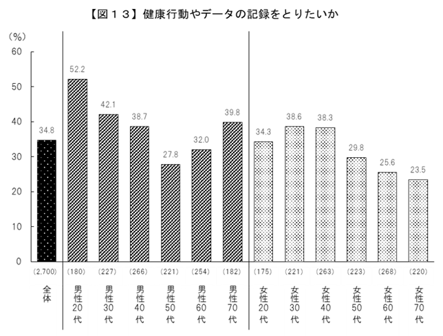 また、心拍数や活動量など、スポーツや健康管理に必要なデータを自動収集できるスマートウォッチの利用意向も徐々に増えつつあります。特に男性では「健康行動やデータの記録を取りたい」という意向が高く、20代で半数以上の52.2%、70代男性で39.8%と高い割合を示しています(図13)。