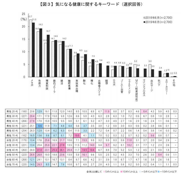 最近メディア(TV番組、雑誌・ウェブ記事など)で話題になっているキーワードについて、気になっているものを選んでもらったところ、「メタボ」「免疫力」「糖質制限」「腸内フローラ」が上位に挙がりました(図3)。昨年の調査から、上位項目に変化はなく、これらの健康キーワードには関心が定着していることが分かります。
