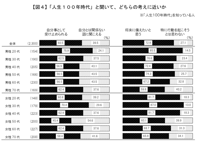 ■「人生100年時代」を自分事として受け止める傾向は、男性では20代、女性では30代で高く、ともに70%を超える。
