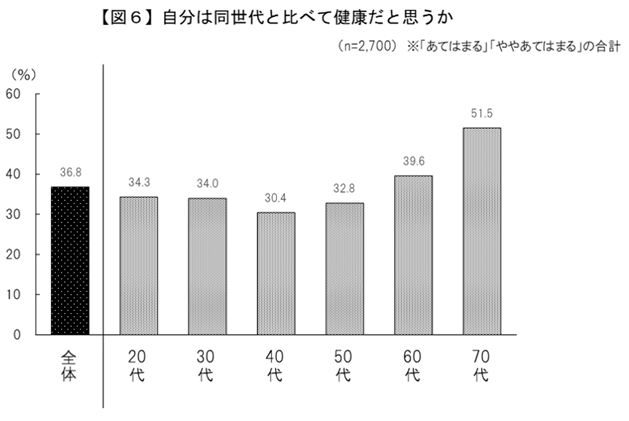 「自分は同世代と比べて健康だと思う」という意識が最も高かったのは70代で、全体の36.8%よりも14.7ポイント高い51.5%でした(図6)。現在の自分の健康に自信があり、生き生きと前向きに健康に向き合うさまがうかがえます。