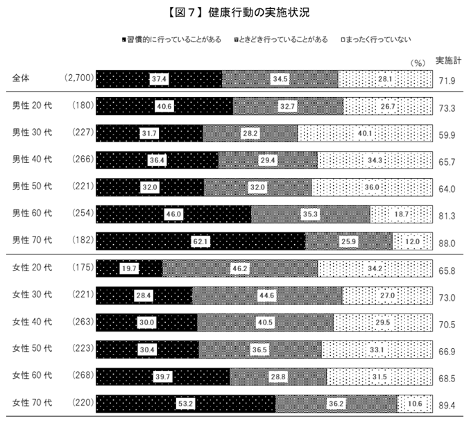 健康のための行動を行っているかという質問に対しては、「習慣的に行っていることがある」「ときどき行っていることがある」を合計すると71.9%にのぼりました(図7)。健康行動を習慣的に実施している人は70代で特に多く、男性62.1%、女性53.2%でした。
