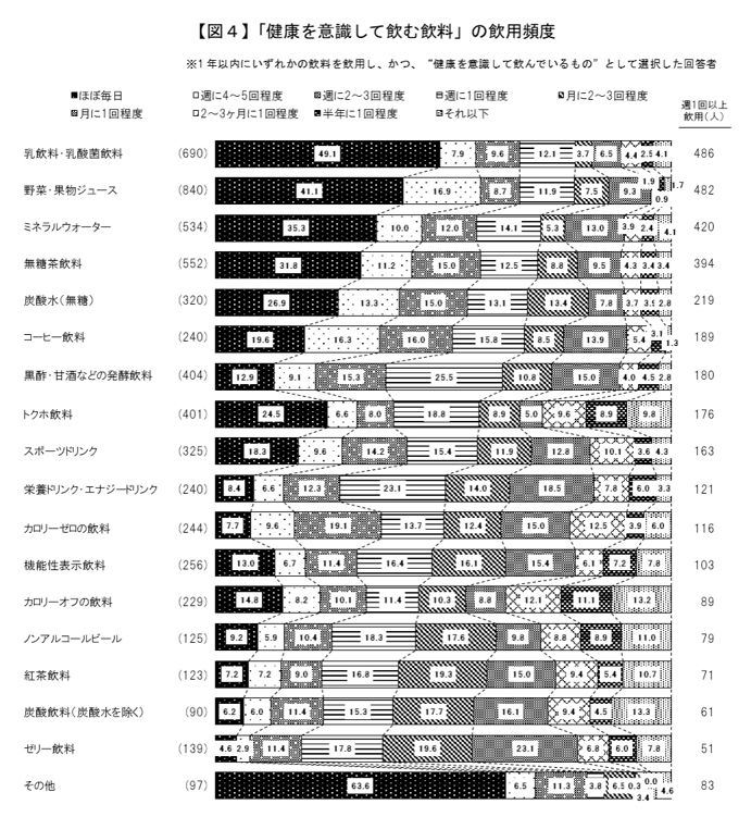 健康を意識して飲む飲料として、週1回以上飲んでいる人が多いのは、多い順に「乳飲料・乳酸菌飲料」、「野菜・果物ジュース」、「ミネラルウォーター」、「無糖茶飲料」、「炭酸水(無糖)」となりました(図4)。「トクホ飲料」は8位、「機能性表示飲料」は12位でした。