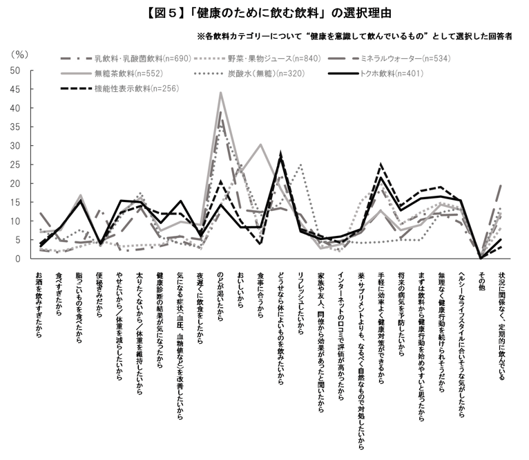 「乳飲料・乳酸菌飲料」、「野菜・果物ジュース」、「ミネラルウォーター」、「無糖茶飲料」、「炭酸水(無糖)」および「トクホ飲料」、「機能性表示飲料」について、健康を意識して飲む飲料として、その飲料を選んだ理由を聞きました(図5)。全体的には「のどが乾いたから」、「おいしいから」、「どうせなら体によいものを飲みたいから」、「手軽に効率よく健康対策ができるから」等が上位になっています。さらに、それぞれの飲料ごとに特徴的な選択理由が見られる中で、トクホ飲料は「気になる症状(血圧、血糖値など)を改善したいから」、「やせたいから/体重を減らしたいから」等が、機能性表示飲料は「無理なく健康行動を続けられそうだから」、「まずは飲料から健康行動を始めやすいと思ったから」、「将来の病気を予防したいから」等が他の飲料と比較して高くなっています。生活者が健康への効果を期待してトクホ・機能性表示飲料を選択する傾向が見られます。