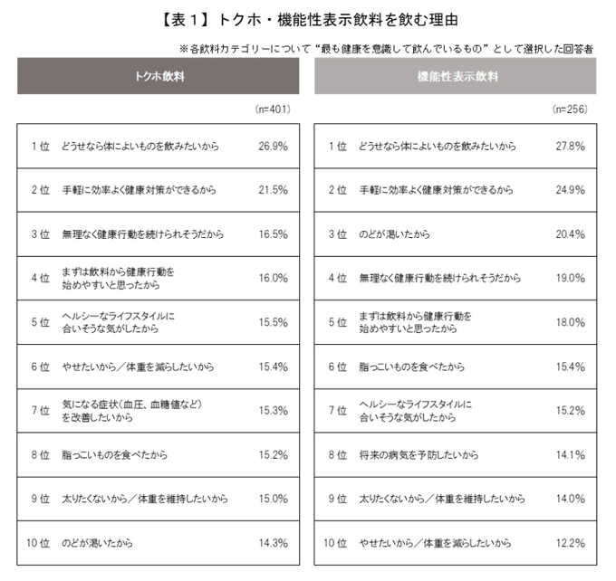 トクホ・機能性表示飲料を飲む理由は、「どうせなら体によいものを飲みたいから」が双方ともに1位でした(表1)。次いで「手軽に効率よく健康対策ができるから」が続きました。こちらの設問からもトクホ・機能性表示飲料が「手軽に健康対策ができる飲料」として受容されていることが分かります。
