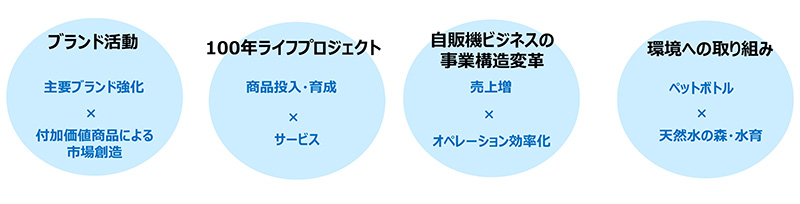 「人生100年時代」という言葉に表されるように健康寿命に対する注目が高まっており、働き方やライフスタイルもますます多様化しています。そのような中、当社はお客様の視点に立ち、「ブランド活動」、「100年ライフプロジェクト」、「自販機ビジネスの事業構造変革」を軸に、生活がより豊かになるような提案をしていきます。