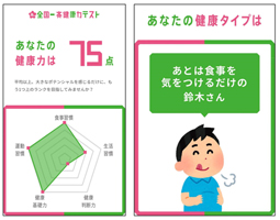 テストに答え終わると、健康力が点数化され、さらに「運動習慣」「食事習慣」「生活習慣」「健康基礎力」「健康判断力」の5つの項目のレーダーチャートが表示されます。このレーダーチャートによって、自分の足りていないポイントや、反対に充分に知識があるポイントを一目で把握できます。さらに、よりわかりやすく健康力を表現するために、多数のフリー素材を提供し、ツイッターのフォロワー13.6万人を誇る“いらすとや”とコラボした健康タイプを発表します。思わずシェアしたくなるようなイラストにもご注目ください。