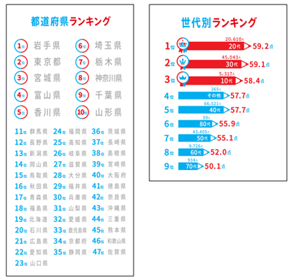 テストの結果から、全国平均点はもちろん、年齢別・性別・都道府県別の平均点を集計し発表しました。「健康力1位の都道府県は岩手県」「年代別に見ると最も健康力が高いのは20代」など、様々な結果を公表しています。