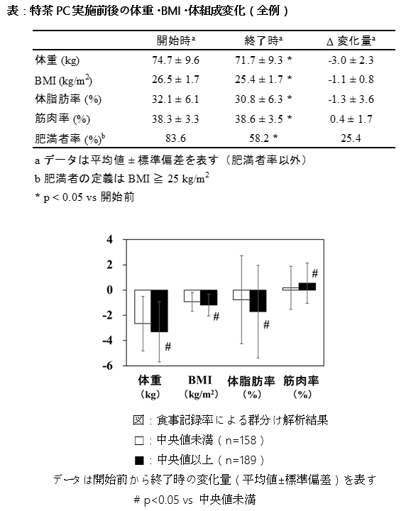 その結果、“特茶PC”の開始時に比べ、終了時には体重、BMI、体脂肪率の低下(平均値として、それぞれ3.0kg、1.1kg/m2、1.3%)、筋肉率の増加(平均値として、0.4%)が認められました。また、食事記録率等による群分け解析の結果から、プログラムへの参加度が高いほど、その改善度が大きいことが示唆されました。