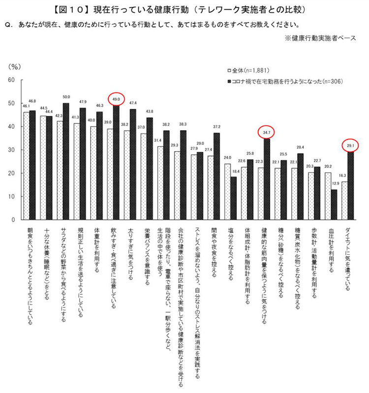 また、「現在健康行動を行っている」と回答した人を対象に、コロナ禍でテレワークを行うようになった人とそうでない人を比較してみると、テレワーク実施者の方が10ポイント以上高いスコアの項目は「飲みすぎ・食べ過ぎに注意している(49.0%)」「健康的な筋肉量を保つように気をつける(34.7%)」「ダイエットに気を遣っている(29.1%)」でした(図10)。通勤機会が減るテレワーク実施者は、運動不足を懸念し今まで以上に健康行動を意識的に取っていると推測されます。