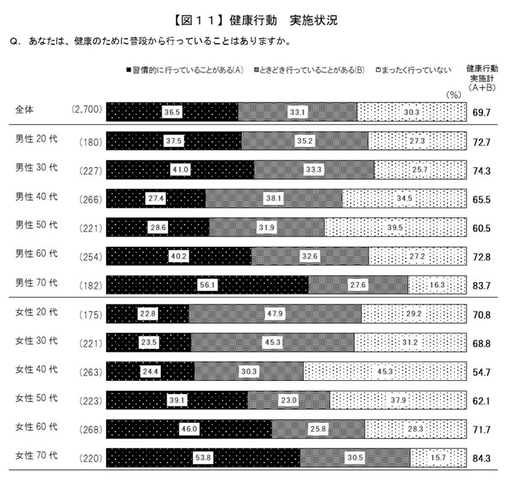 健康行動の実施率を見ると、全体で69.7%の人が何らかの健康行動を実践しています。しかし習慣化の割合を見ると全体の36.5%にとどまっています(図11)。