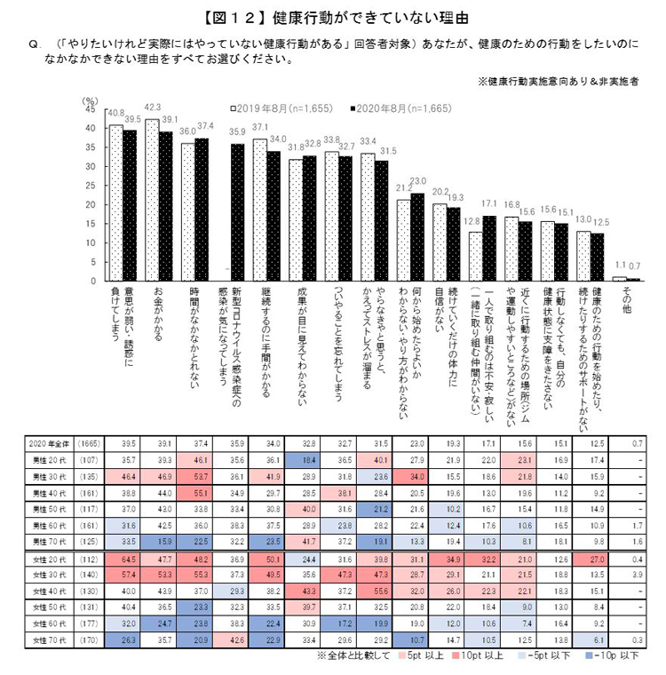 健康行動を実施する意向があるにもかかわらずできていない人を対象に、その理由を聞いてみると、「意思が弱い・誘惑に負けてしまう(39.5%)」が1位で、「お金がかかる(39.1%)」「時間がなかなかとれない(37.4%)」「新型コロナウイルス感染症への感染が気になってしまう(35.9%)」が続きました(図12)。