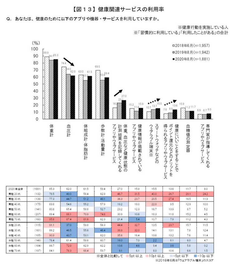 利用している健康関連サービスについて、2018年、2019年の調査結果も合わせて推移を示しました(図13)。この2年で血圧計の利用率は低下傾向にあり、一方で健康に関するウェブサービスやウェアラブル端末の利用は、20代、30代がけん引する形で増加傾向にあります。