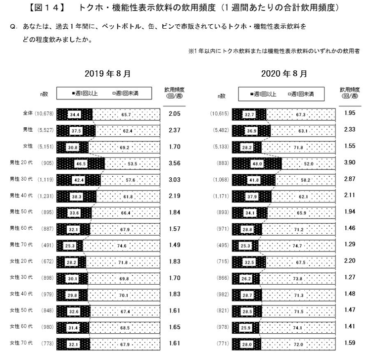 ■トクホ・機能性表示飲料の飲用頻度は一週間当たり平均1.95回と昨年よりも微減となったが、20代の飲用頻度は増加した。