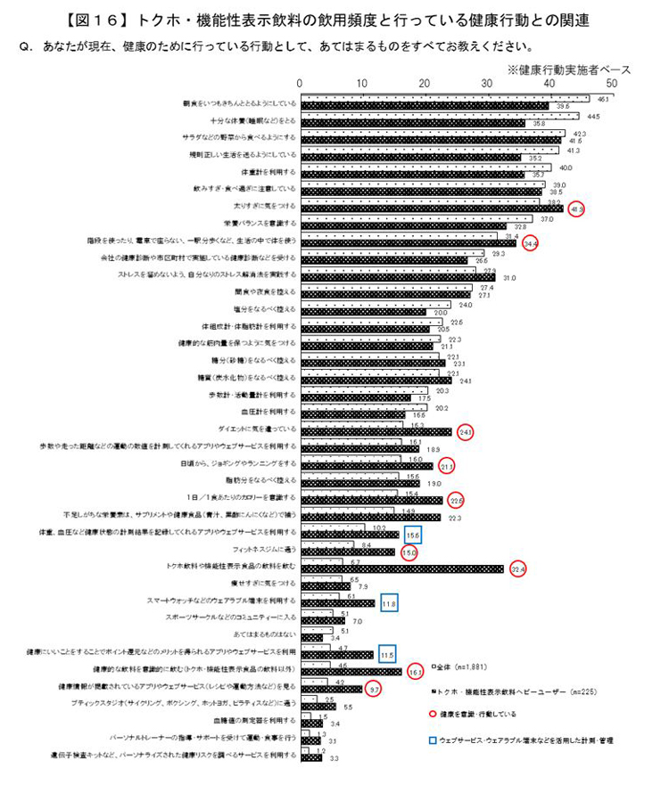 週1回以上の頻度でトクホ・機能性表示飲料を飲んでいる人(ヘビーユーザー)が行っている健康行動は、カロリーを意識する、意識的に身体を使う、ジムに通うなど、健康行動を意識・実践している割合が高くなっています(図16・丸)。また、手軽にできる健康管理系ウェブサービスやウェアラブル端末などを活用して健康行動を計測・管理する「健康管理のデジタル化」が、全体と比較し進んでいる傾向もあらわれました(図16・四角)。
