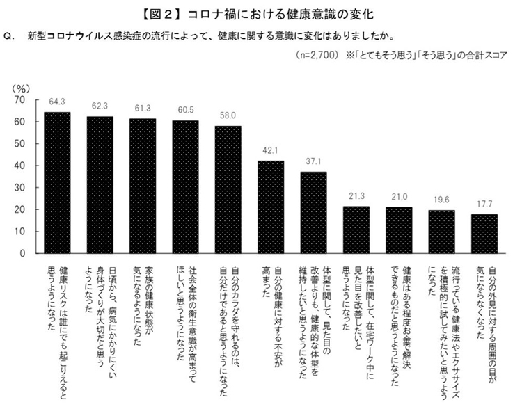 新型コロナウイルス感染症の流行によって、健康に関する意識に変化があったかを聞いたところ、「健康リスクは誰にでも起こりえると思うようになった」が64.3%と最も多く、次いで「日頃から、病気にかかりにくい身体づくりが大切だと思うようになった」(62.3%)が挙げられました。また、「自分のカラダを守れるのは、自分だけであると思うようになった」についても6割近くが感じており、健康に対する自己防衛意識が高まっていることがわかります(図2)。