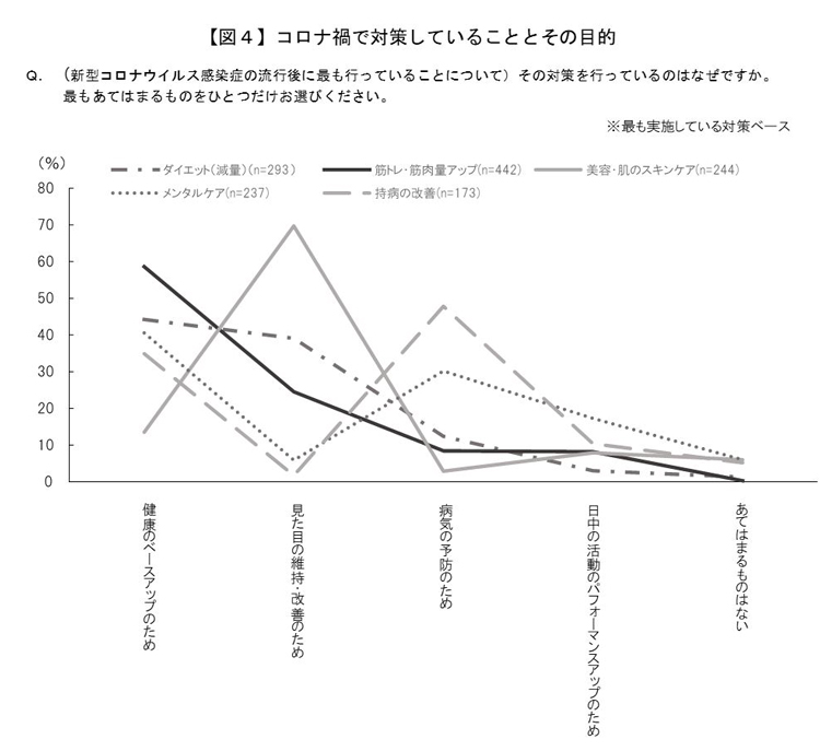 また、対策をしている理由としては、美容を除くと「見た目の維持・改善のため」よりも「健康のベースアップのため」のほうが高い割合でした(図4)。ここでも「見た目の改善」より「身体づくり」が上回り、健康意識の高まりが見て取れます。