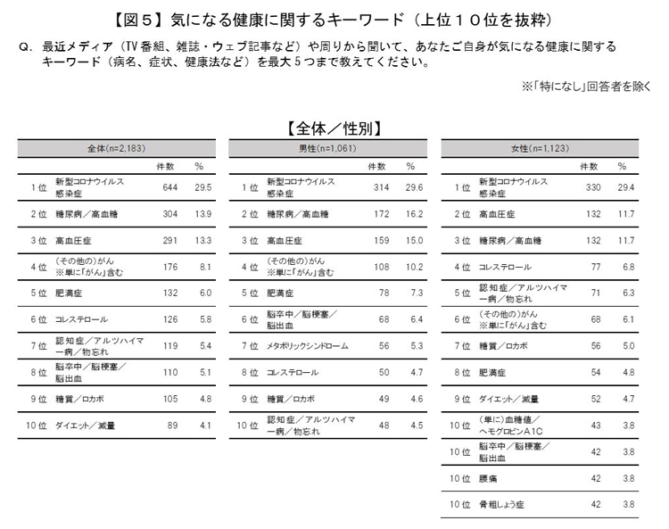 最近、気になっている自身の健康に関するキーワード(病名、症状、健康法など)について、自由回答で聴取しました(図5)。全体では「新型コロナウイルス感染症」がトップで、次いで「糖尿病/高血糖」、「高血圧症」でした。性別年代別に見ても、生活習慣病関連のキーワードが上位に挙がっており、関心が高いことがうかがえます。