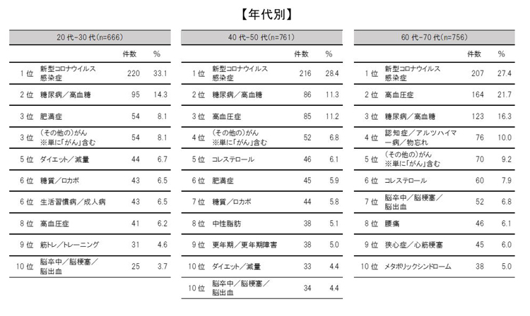 ■気になる自身の健康に関するキーワードは、トップの「新型コロナウイルス感染症」に次いで、第2位「糖尿病/高血糖」、第3位「高血圧症」という結果に。多くの世代が生活習慣病関連項目に高い関心を持った。