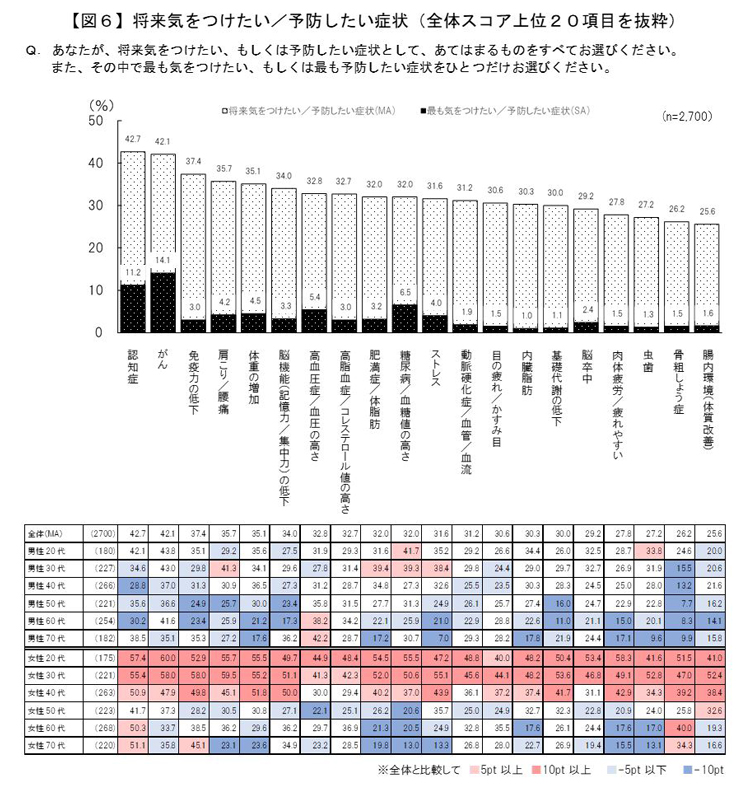 将来気をつけたい/予防したい症状について聞いたところ、「認知症(42.7%)」「がん(42.1%)」「免疫力の低下(37.4%)」がトップ3でした(図6)。また、最も予防したい症状について聞くと、「がん」「認知症」に続いて「糖尿病/血糖値の高さ」が3位にランクインしました。特に20代、30代で糖尿病や血糖値の高さに関する不安が大きい傾向が見られます。