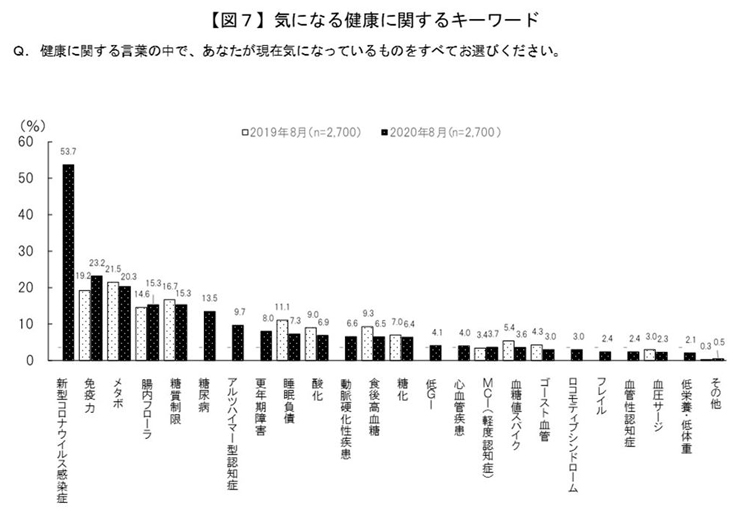 最近メディア(TV番組、雑誌・ウェブ記事など)で話題になっている健康に関するキーワードについて、気になっているものについて聞くと、トップ5は「新型コロナウイルス感染症(53.7%)」「免疫力(23.2%)」「メタボ(20.3%)」「腸内フローラ(15.3%)」「糖質制限(15.3%)」でした(図7)。コロナ禍の影響を受け、前年トップだった「メタボ」を抑えて「新型コロナウイルス感染症」および「免疫力」が上位になっています。