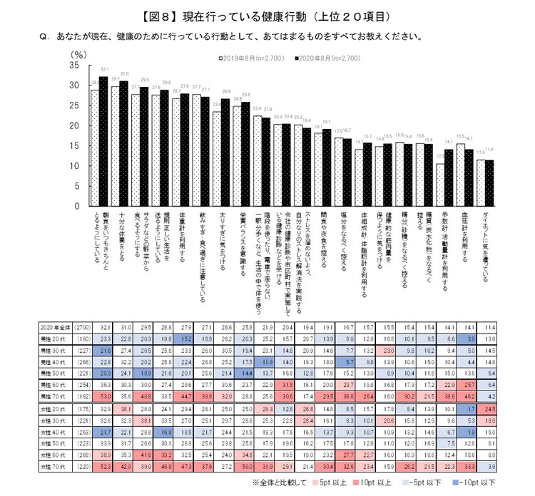 現在実際に行っている健康行動について聞いてみると「朝食をいつもきちんととるようにしている(32.1%)」「十分な休養をとる(31.0%)」「サラダなどの野菜から食べるようにする(29.5%)」がトップ3でした(図8)。第1位の「朝食をいつもきちんととるようにしている」は前年調査との差分(3.3ポイント)も大きく、新しい生活様式の中で顕著に変化が表れた健康行動であるといえます。