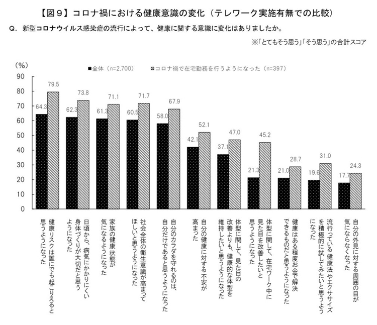 コロナ禍でテレワークが増加したことがどのような影響を与えているかを見たところ、コロナ禍でテレワークを行うようになった人のほうが、健康意識が強くなっていることがわかります(図9)。以前とは異なる生活となり、運動習慣や生活リズムが変わったことで、より健康に目を向ける機会が増えたと推測されます。