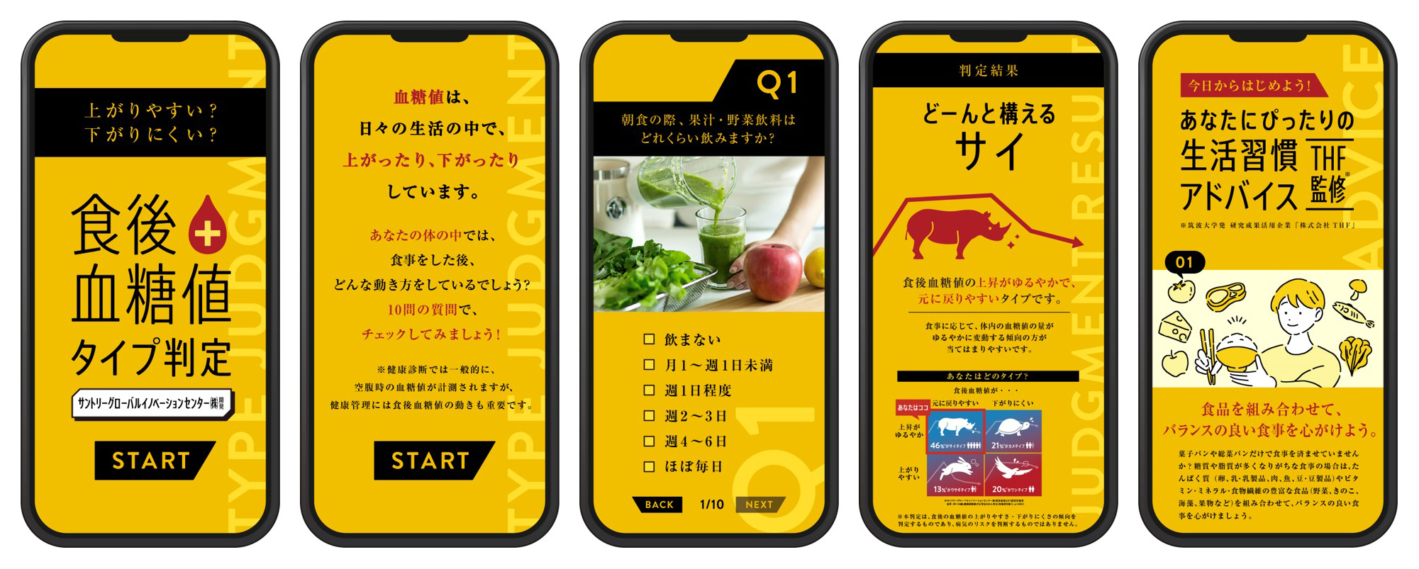 サントリーの基礎研究部門であるサントリーグローバルイノベーションセンター(株)の研究をもとに開発された、生活習慣を含む10問の質問で構成されており、食後の血糖値の上がりやすさや、下がりにくさといった傾向を判定できるサービスとなっています。本サービスを通じて、ご自身のことを、より深く知っていただくきっかけを提供することで、より多くのお客さまの健康に貢献したいと考えています。詳細は、「食後血糖値タイプ判定」紹介ページをご確認ください。