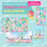 「スターバックス ピーチーパイナップルミルク with ピーチジェリー」をイメージした、オリジナルイラストの壁紙をプレゼントいたします。商品特設ページにアクセスいただき、壁紙ダウンロードコーナーより取得いただけます。パソコン用、スマートフォン用の2サイズをご用意しております。晴れやかな夏本番を、夏らしいオリジナル壁紙と一緒に過ごしてみませんか?