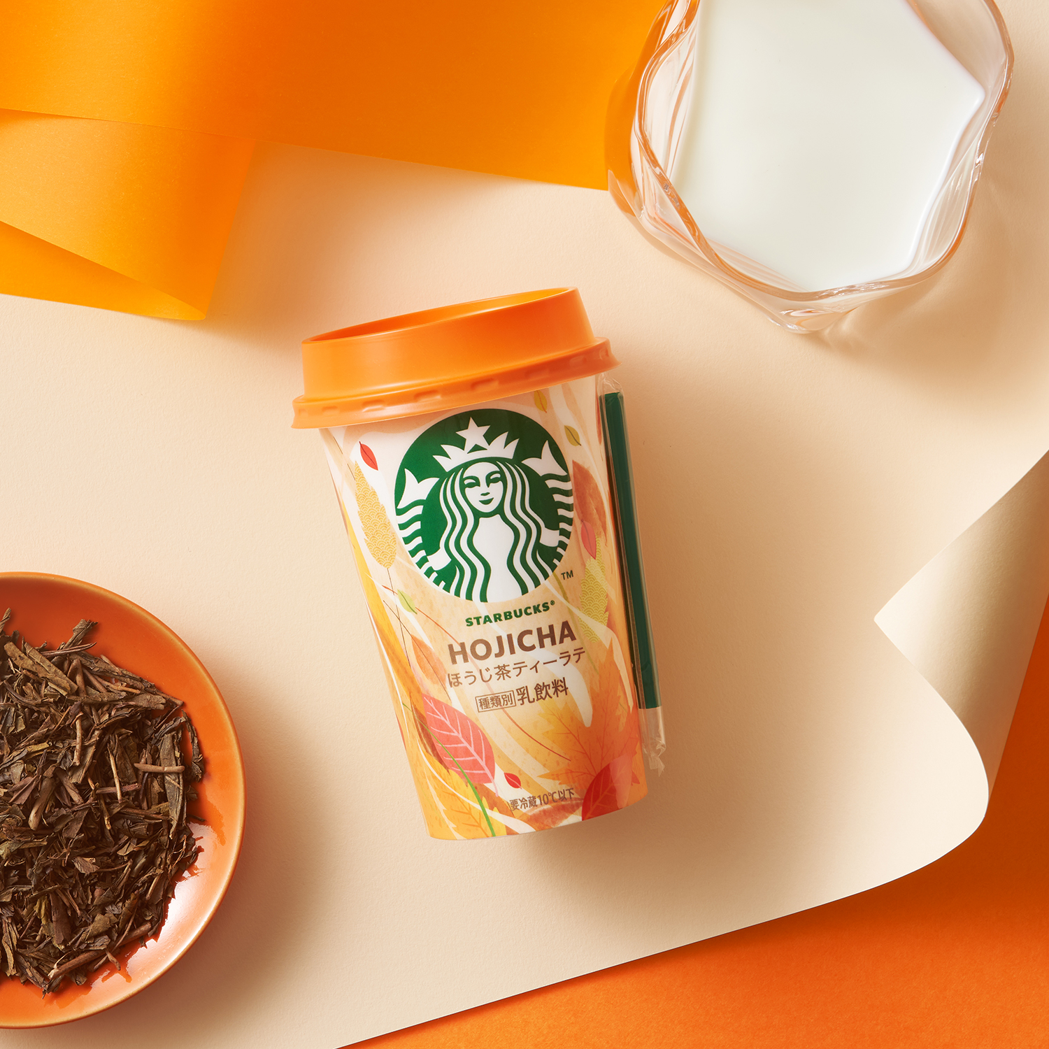 立ち昇るほうじ茶の香りとミルクが溶け合う様子を表現しました。赤やオレンジなど鮮やかな色味を使用し、紅葉をイメージした秋らしいデザインです。