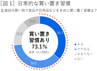 普段の買い物で食品や日用品などを多めに買い置く習慣について聞きました。買い置き習慣が「ある」と答えたのは全体の73.1%で、多くの人が日常的な買い置き習慣を身に付けています[図1]。 |