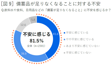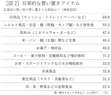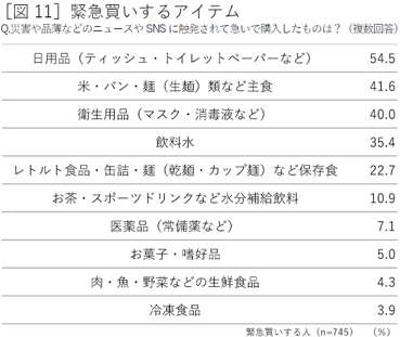 飲料水や食料、日用品などの「備蓄が足りなくなること」に不安を感じるかと聞くと、81.5%が「不安に感じる」と答えています[図9]。また、災害や品薄などのニュースやSNSに触発されて、急いで買いものに出た経験を聞くと、32.4%と約3人に1人が「経験がある」と答えています[図10]。具体的なアイテムを聞くと、ティッシュ・トイレットペーパーなどの「日用品」(54.5%)、米・パン・麺(生麺)類などの「主食」(41.6%)、マスク・消毒液などの「衛生用品」(40.0%)、ミネラルウォーターなどの「飲料水」(35.4%)が多くなっています[図11]。日常的な買い置きアイテム(図2参照)と比べ、主食や衛生用品を緊急で買い足すことが多いようです。