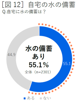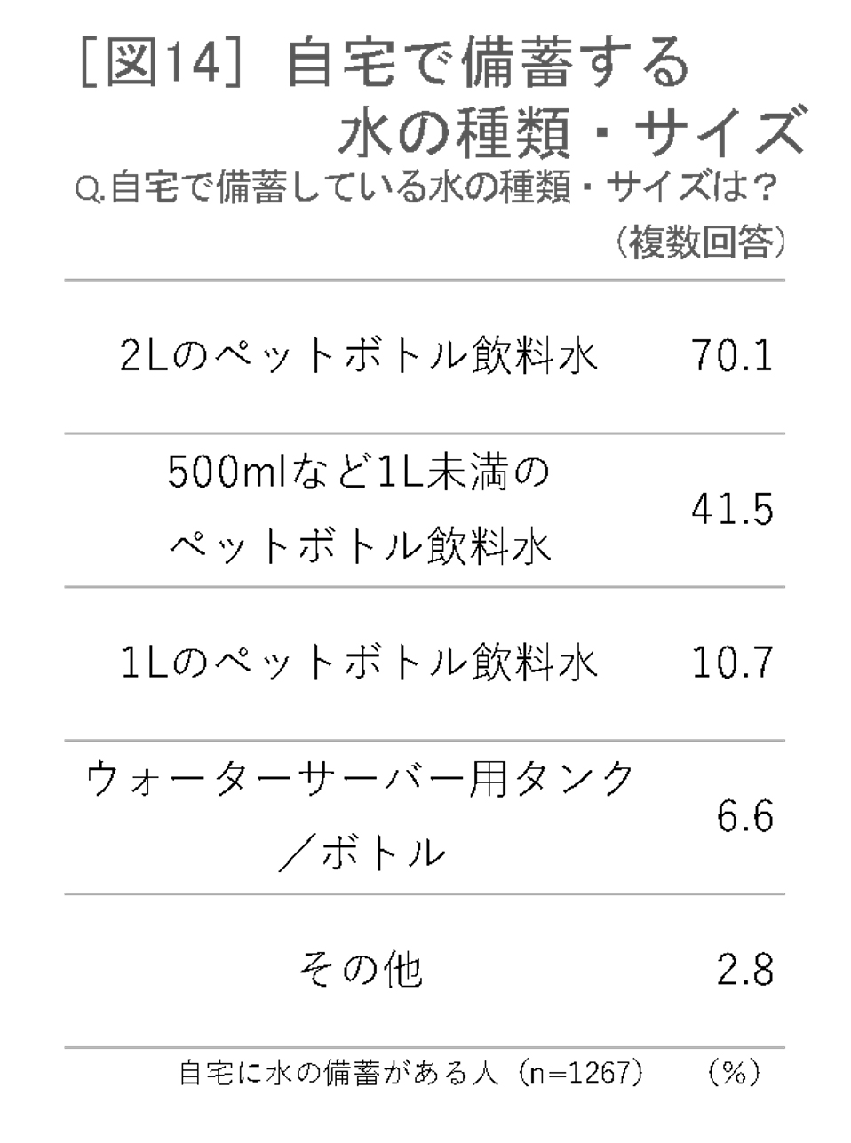 ここからは水の備蓄についての調査結果です。自宅の水の備蓄の有無について聞くと、全体の55.1%しか水の備蓄が「ある」と答えていません[図12]。水の備蓄がないと答えた人に水を備蓄しない理由を聞くと、「備蓄のスペースがない」(31.0%)、「なんとなく備蓄する習慣がない」(29.2%)が挙げられました[図13]。備蓄している水の種類・サイズを聞くと、「2Lのペットボトル飲料水」(70.1%)が最も多く、「500mlなど1L未満のペットボトル飲料水」(41.5%)、「1Lのペットボトル飲料水」(10.7%)の順となりました[図14]。