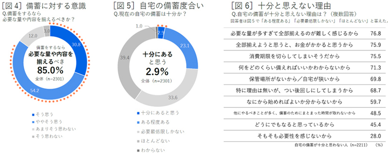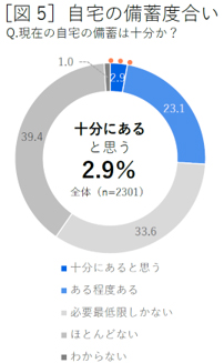 備蓄に対する意識を聞くと、85.0%が「備蓄をするなら必要な量や内容を揃えるべき」と答えている[図4]一方、自宅の備蓄は十分かと聞くと、「十分にあると思う」と答えた人はわずか2.9%しかいませんでした[図5]。