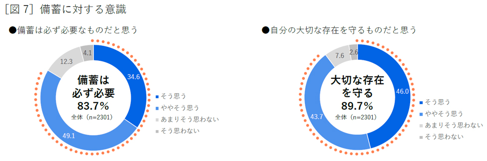 備蓄に対する意識を聞くと、83.7%が「備蓄は必ず必要なもの」、89.7%が「大切な存在を守るもの」と答えています[図7]。
