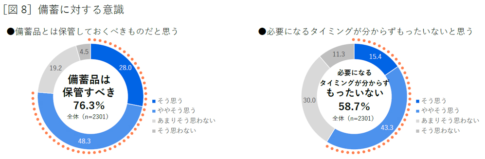 さらに、備蓄品について聞くと、76.3%とおよそ4人に3人が「備蓄品とは保管しておくべきものだと思う」と回答。備蓄品は「必要になるタイミングが分からずもったいないと思う」と感じる人が約6割(58.7%)もいました[図8]。