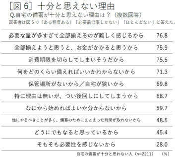 自宅の備蓄が十分と思えない理由を聞くと、「必要な量が多すぎて全部揃えるのが難しく感じるから」(76.8%)、「全部揃えようと思うと、お金がかかると思うから」(75.9%)といった理由が挙げられました[図6]。
