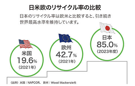 日本においては、ペットボトルの回収スキームが整っていることもあり、ペットボトルの回収率・リサイクル率は約9割※5と、欧米諸国と比較して非常に高い水準となっています。清涼飲料業界では、リサイクルのなかでも、限りある資源を国内で有効利用できる「ボトルtoボトル」水平リサイクルを推進しています。業界として、2030年に「ボトルtoボトル」水平リサイクル比率5割を目標としており、現状約3割※5となっています。
