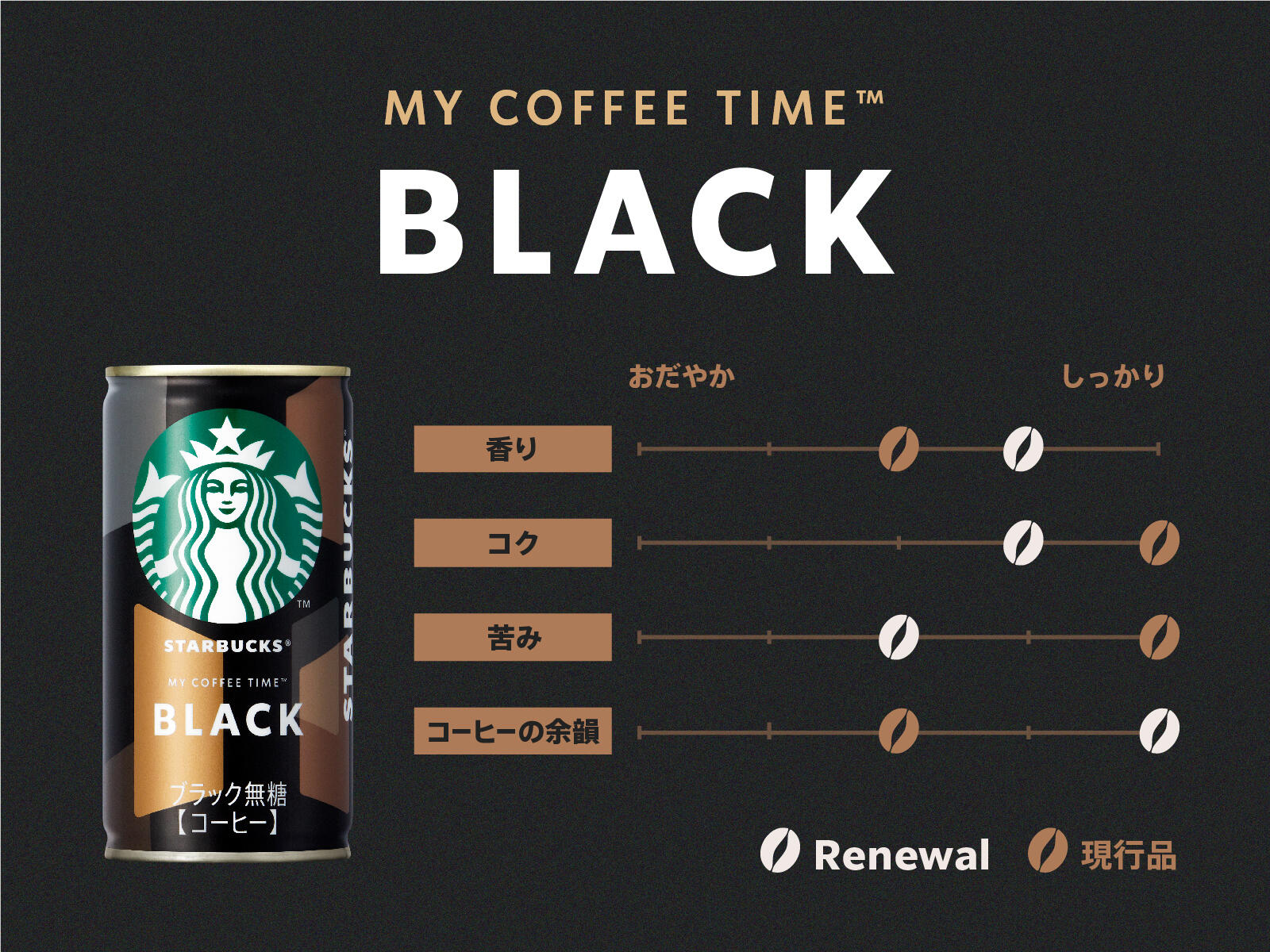 「スターバックス MY COFFEE TIME」は、1杯のコーヒーを通し、まるでお気に入りのカフェにいるかのような心地よい“自分時間”の演出をコンセプトとした、ショート缶コーヒーシリーズです。ご自宅やオフィスなどシーンを選ぶことなく、気軽にスターバックスの味わいをお楽しみいただけるシリーズとして、普段缶コーヒーに親しみのない方にも愛飲いただくなど、2024年の発売以来、ご好評いただいています。今回、従来以上に思い思いの“自分時間”に寄り添い心地よさを高められるよう、奥深い余韻とやさしい味わいを楽しめる商品へとリニューアルします。
