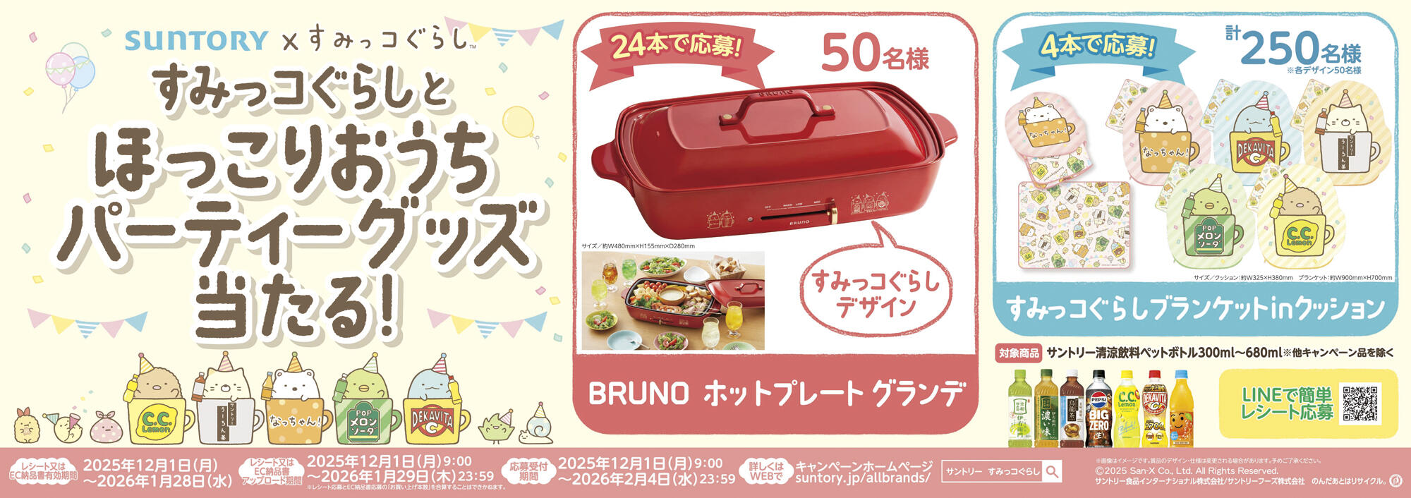 対象商品を購入の上、所定の方法で応募することで、描き下ろしデザインの「すみっコぐらし」オリジナルホームパーティーグッズなどが当たるキャンペーンを実施します。
