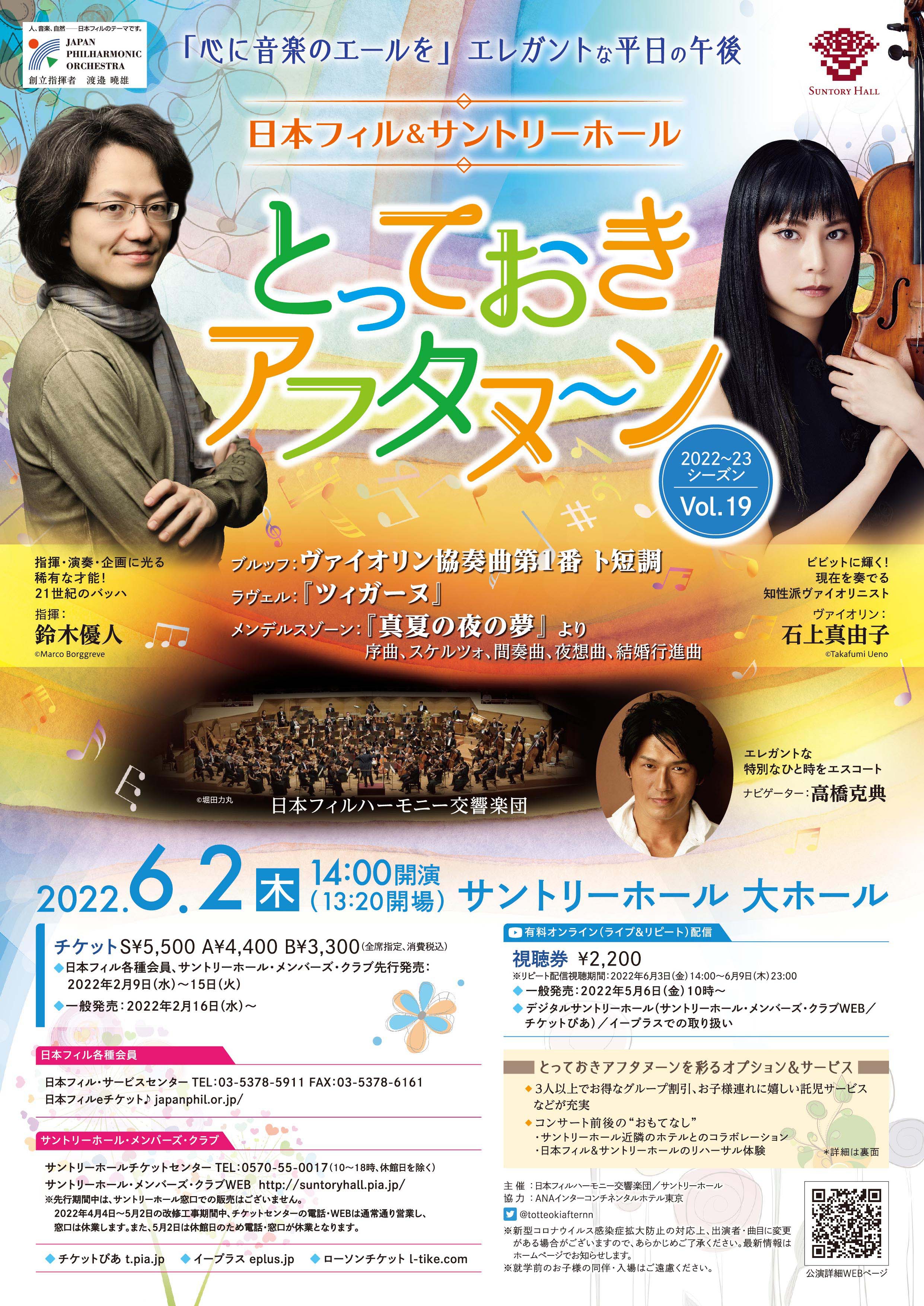 「とっておき アフタヌーン」は、魅力的な指揮者とソリストたちの、気さくなトークを交えた「オーケストラ名曲コンサート」です。2022年6月2日(木)14:00開演のコンサートでは、指揮に鈴木優人、ソリストに石上真由子(ヴァイオリン)を迎え、俳優の高橋克典のナビゲートで、クラシック音楽を初めて聴く方にも親しみやすい内容でお届けします。とっておきな午後を演出するたくさんの「おもてなし」をご用意して、お待ちしています。託児サービスやグループ割引といったオプション&サービスのほか、サントリーホール近隣のホテル、 ANAインターコンチネンタルホテル東京から「特別なおもてなし」をご用意。アフタヌーンティーをお得にお楽しみいただけます。