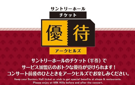 2022年6月2日(木)当日のサントリーホールのチケット(半券)をアークヒルズのサービス加盟店舗でお見せいただくと、割引や限定メニューなどのおトクな優待をご利用いただけます。