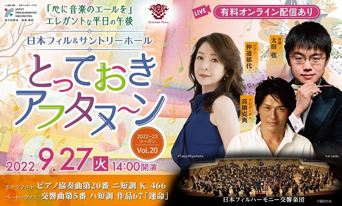 日本フィルとサントリーホールが贈る、エレガントな平日の午後『とっておきアフタヌーン』。2022-23シーズン Vol.20のソリストは、日本を代表するピアニスト、深く音楽を探求し続けている仲道郁代さんです。若き実力派指揮者、太田弦さんが振る日本フィルハーモニー交響楽団との共演に選ばれたのは、モーツァルトのコンチェルト。モーツァルトという作曲家、そして作品への思いを伺います。