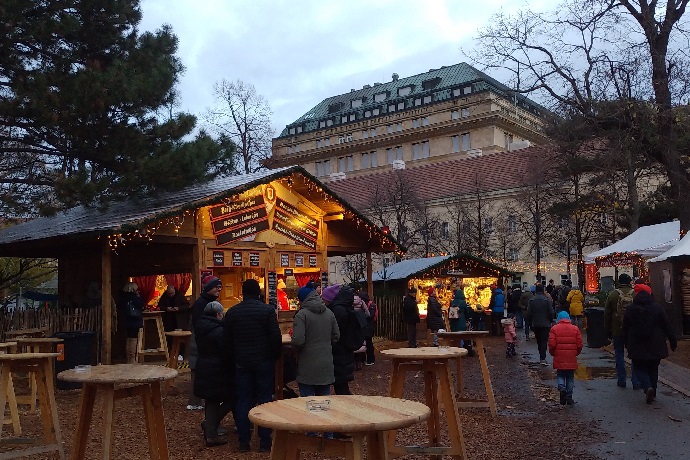 それを受けてこの時期になると、街のそこかしこの広場には、クリスマス・マーケットが出現する。最近では、ウィーン大学のキャンパス内でもクリスマス・マーケットが開かれるほどの大ブーム。クリスマス用の様々な飾りはもちろんのこと、冷えた身体を温めてくれるホットワインやプンシュといったアルコール類(アルコールが苦手な人や子供向けに、ノン・アルコールのバージョンもある)、さらにはジャガイモを主体とした生地を薄く伸ばして油であげた「ランゴシュ」というスナックが代表的な売り物だ。