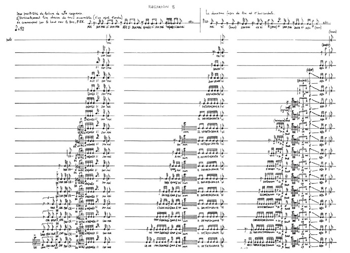 『レシタシオン』の一部の曲では、一連の音(低いド、高いファ♯、中音域のミなど)が一連の言葉の要素(音素「u」、音節「ki」など)、また一連の音の色彩(ゴングを思わせる音、フルートを思わせる音など)と固定的に結びついている。ある音を耳にするたび、同じ「テクスト」と「音色」が現れるというわけだ。アペルギスによるこれらの要素の扱い方は、子どもが小石、砂利、木の切れ端を使って遊ぶ様子を彷彿とさせる。彼はアルファベットを創りだし、それらの音素材をさまざまな順番で並べてみたり、架空の物語をスケッチしてみたりする――あるいはむしろ、楽譜に固定された寄せ集めからわれわれ自身の架空の物語を作りだす方法を、彼は与えてくれているのかもしれない。