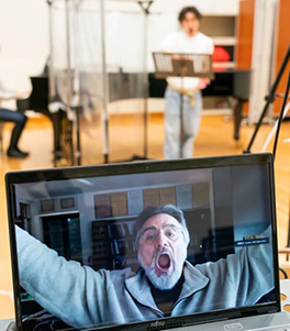第5期生のレッスンがスタートして19年秋にサッバティーニが来日、20年3月に開催予定の「オペラティック・コンサート」の準備が進められていたところ、20年に入り新型コロナウイルス感染症の影響で公演が中止となりました。アカデミーの通常研修会も一時休止を余儀なくされましたが、4月にYouTube動画投稿によるレッスンを開始、6月には感染症拡大防止のためのガイドラインを策定し、コーチング・ファカルティによる対面レッスンを再開。さらに、ローマ在住のサッバティーニによるオンライン・レッスンも6月より実施しました。オペラ・アカデミー初の試みとなりましたが、発声の確認からイタリア古典歌曲の指導まで、サッバティーニは対面と変わらず、情熱的なレッスンを繰り広げました。