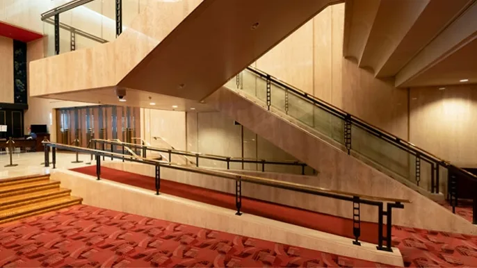 ホワイエから1階席へはスロープで移動できます。2階席へはエレベーターをご使用ください。