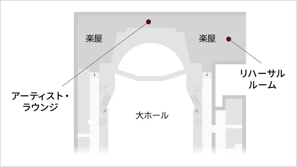 アーティストたちが最良のコンディションで演奏にのぞめるよう、諸設備には快いゆとりを心がけ、きめ細かな配慮を施しています。楽屋は、大ホール用として10室。