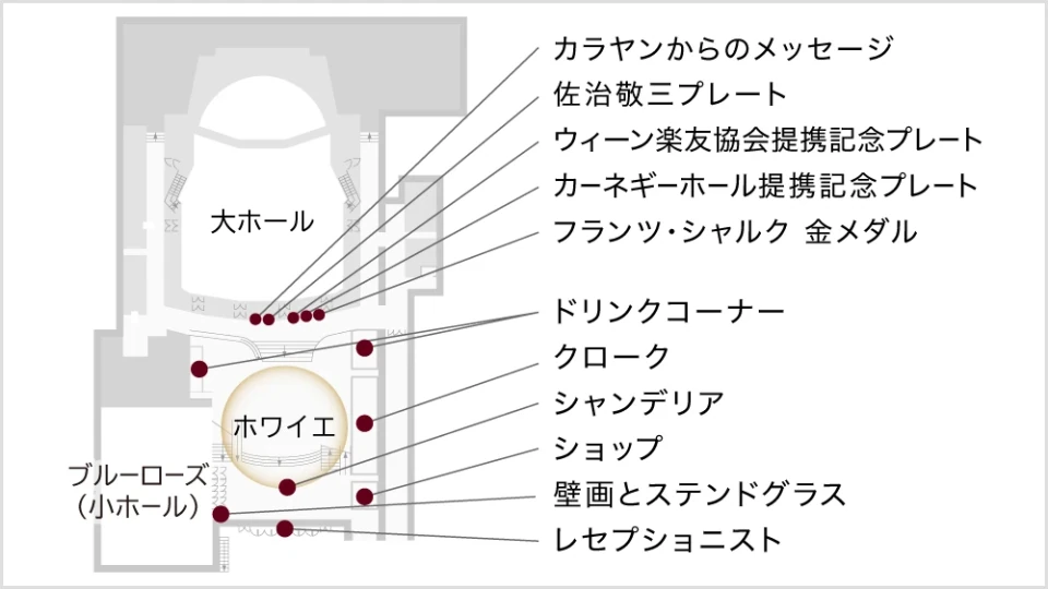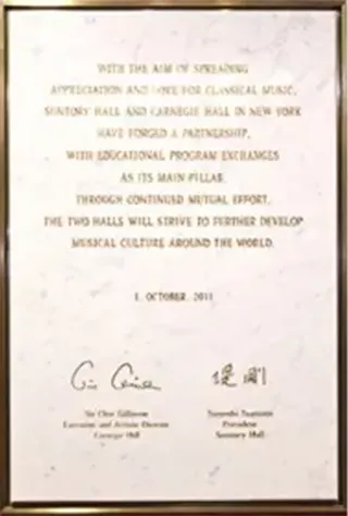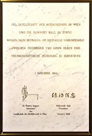 2006年10月、サントリーホールは、ウィーン・フィルの本拠ウィーン楽友協会ホールを企画運営する同協会と提携し、双方のプログラムやアイディアを互いに活用し、日本とオーストリアの音楽文化の発展につとめることとしました。(ウィーン楽友協会でも2007年2月に刻板が設置されました)
