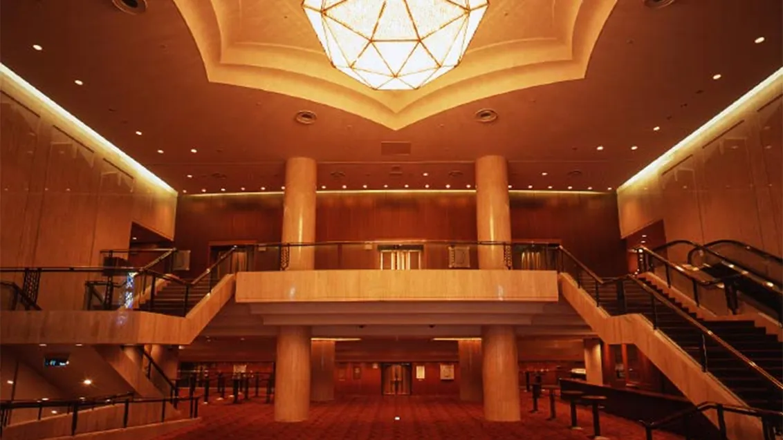 ホワイエの天井をご覧ください。光のシンフォニー「響」と題されたこの巨大なシャンデリアが燦然と輝いています。作者は、世界的に活躍する照明デザイナーの石井幹子氏。